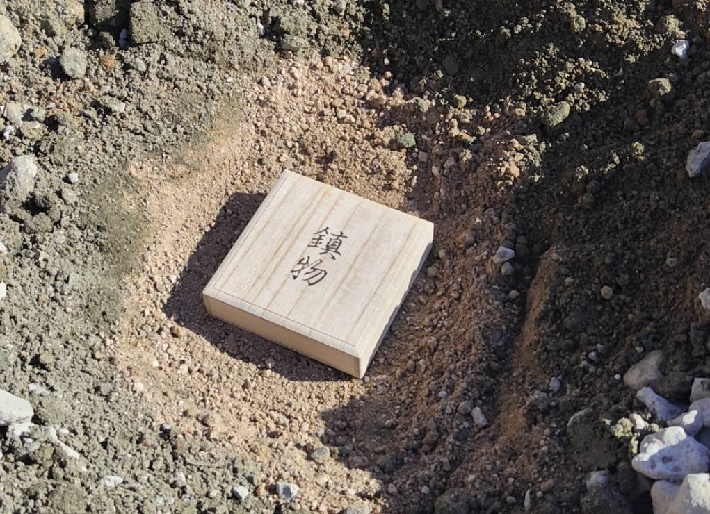 先日は土地の神様を鎮め、工事の安全と建物と中に住まう人の平穏無事を祈る「鎮物(しずめもの)」を納めました。